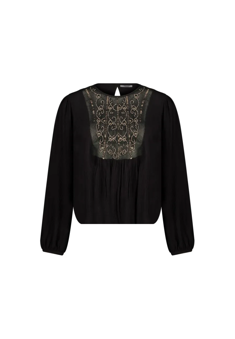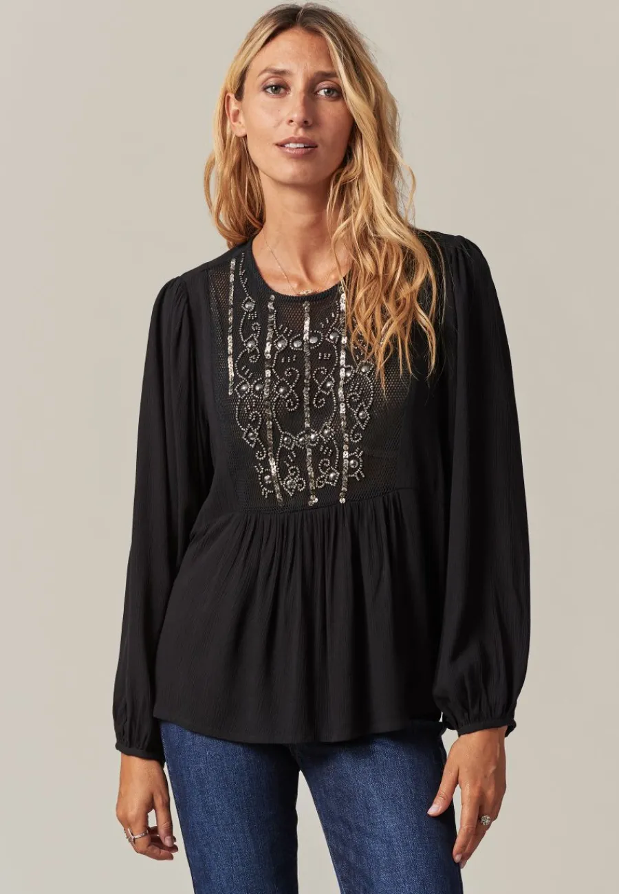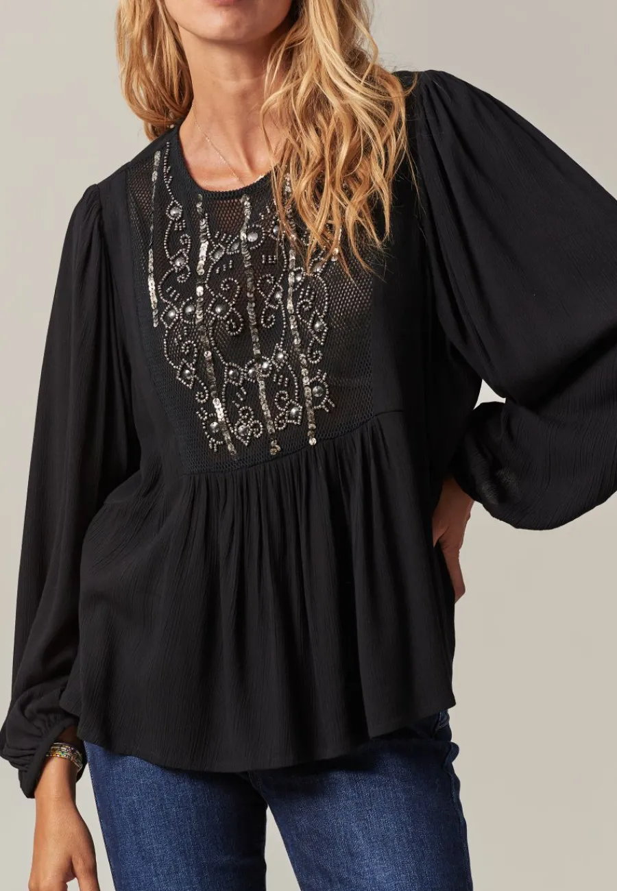 Cette blouse se distingue par son magnifique tissu résille au niveau de la poitrine, orné de motifs en perles et sequins qui ajoutent une touche de glamour discret. Ses détails brillants créent un effet eblouissant qui se prête aussi bien aux journées qu’aux soirées.