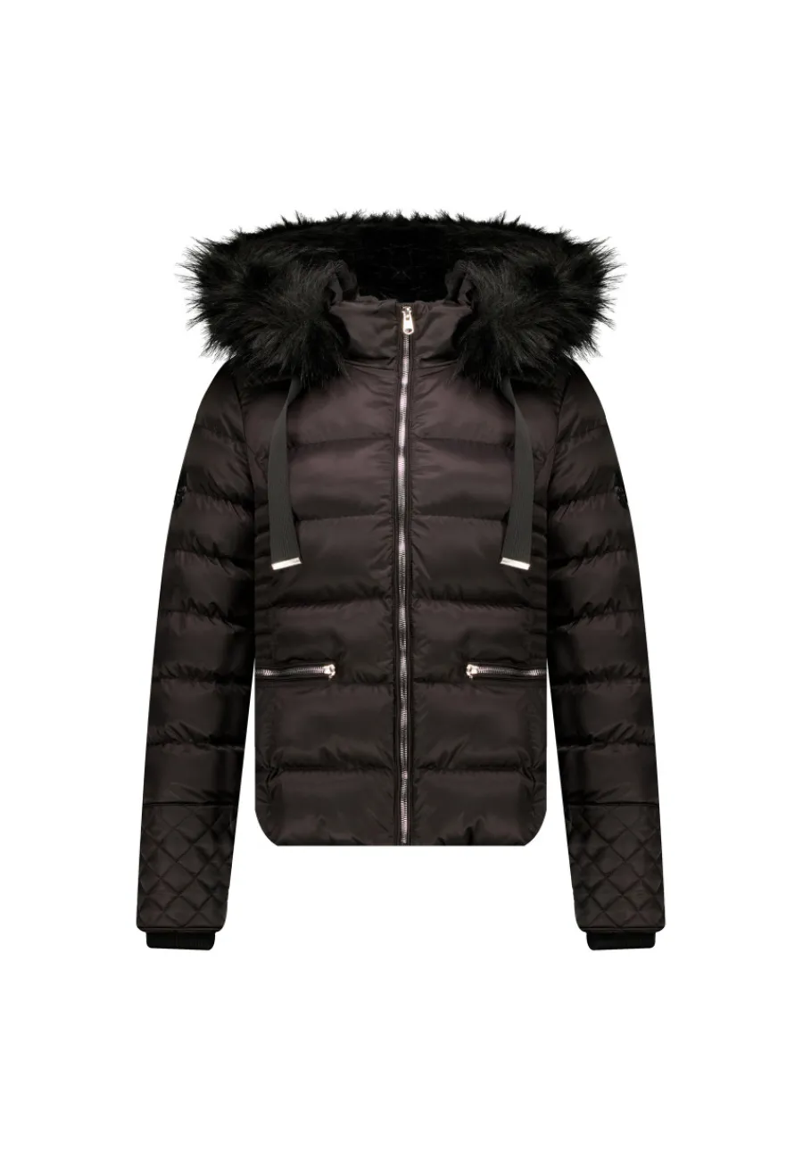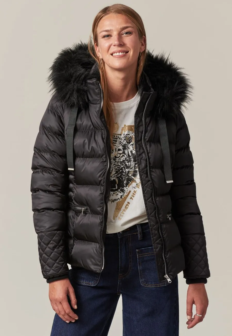 Conçue pour tenir chaud, cette doudoune matelassée est dotée d’un col haut et d’une capuche fixe avec un collier en imitation fourrure. La pièce parfaite pour affronter l’hiver sans compromis sur le style !