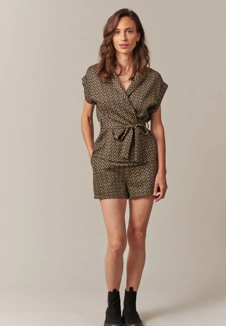 En vacances, associez cette combishort à motifs géométriques à des sandales et un sac en osier pour une allure estivale et détendue. Au travail, portez-la avec des bottines et un perfecto pour un look professionnel.