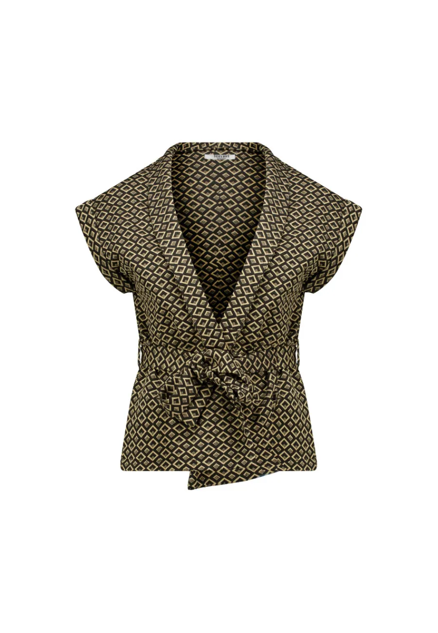 Cette pièce unique se caractérise par un motif géométrique élégant. Ses manches courtes à revers et son col châle ajoutent une touche de sophistication, tout comme la ceinture à nouer à la taille. La silhouette est structurée et intemporelle.