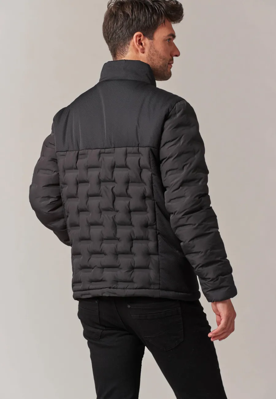 Cette veste à manches longues se distingue par sa conception bi-matière, mélangeant tissu lisse et tissu effet nid d’abeille pour un look unique et sophistiqué. Le matelassage graphique ajoute une touche d’originalité pour créer cette veste tendance et branchée.