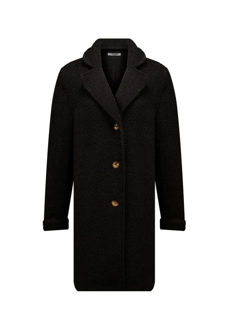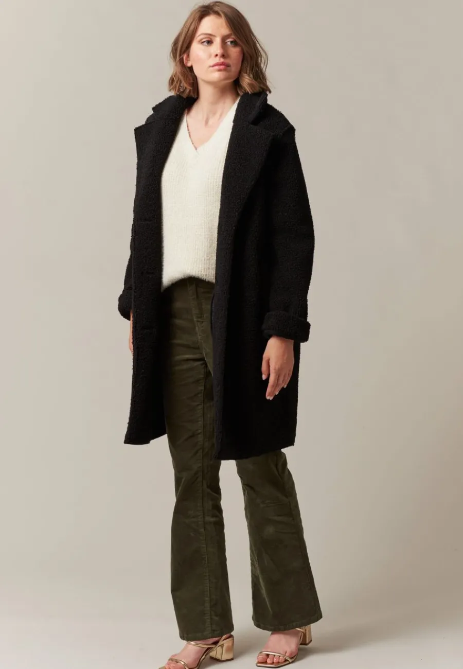 Le manteau IRSA est boutonné sur le devant, offrant une finition élégante à ce modèle. Sa coupe mi-longue en fait une pièce polyvalente, parfaite pour être portée avec une jupe ou un pantalon. Ce manteau mêle avec brio sophistication et confort douillet, faisant de lui l’atout des jours froids.