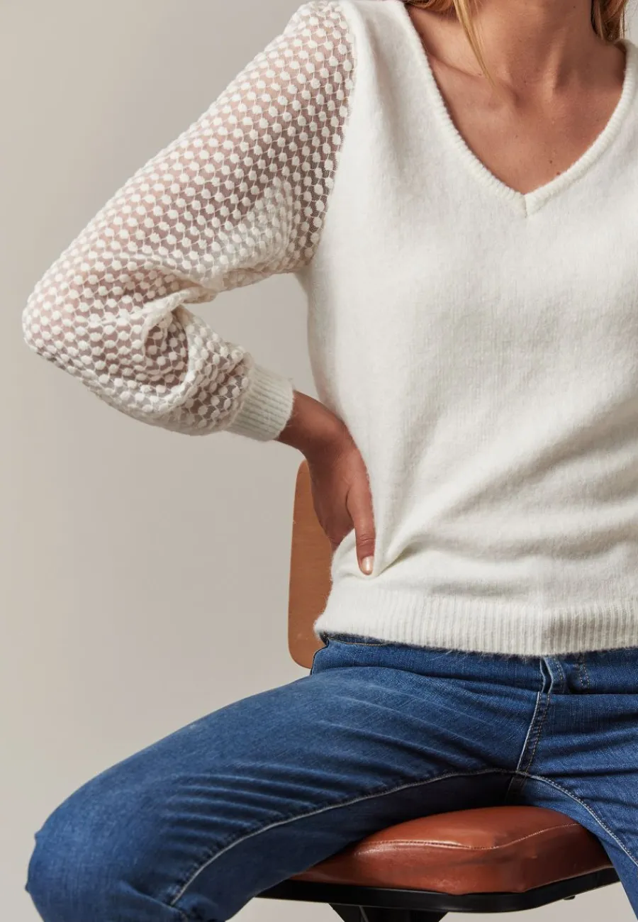 Ce pull trouve son originalité dans ses manches à bords côtés. Ces dernières jouent la transparence et sont ornées d’un motif géométrique brodé, ajoutant une touche de profondeur et d’originalité à votre tenue.