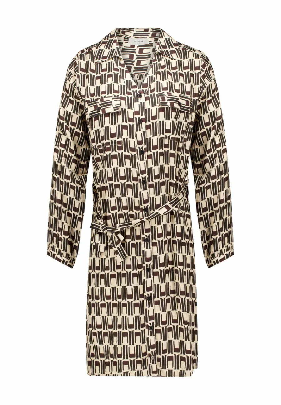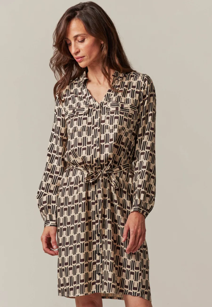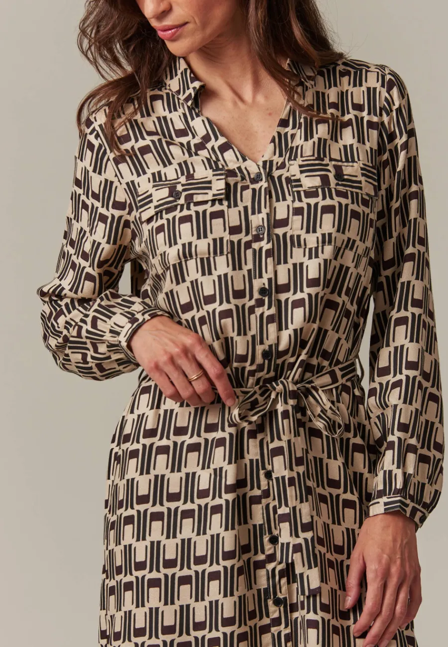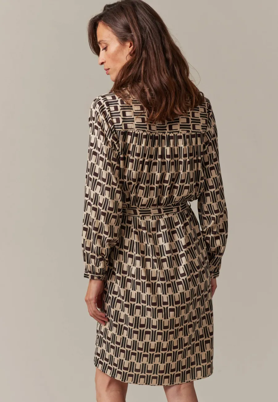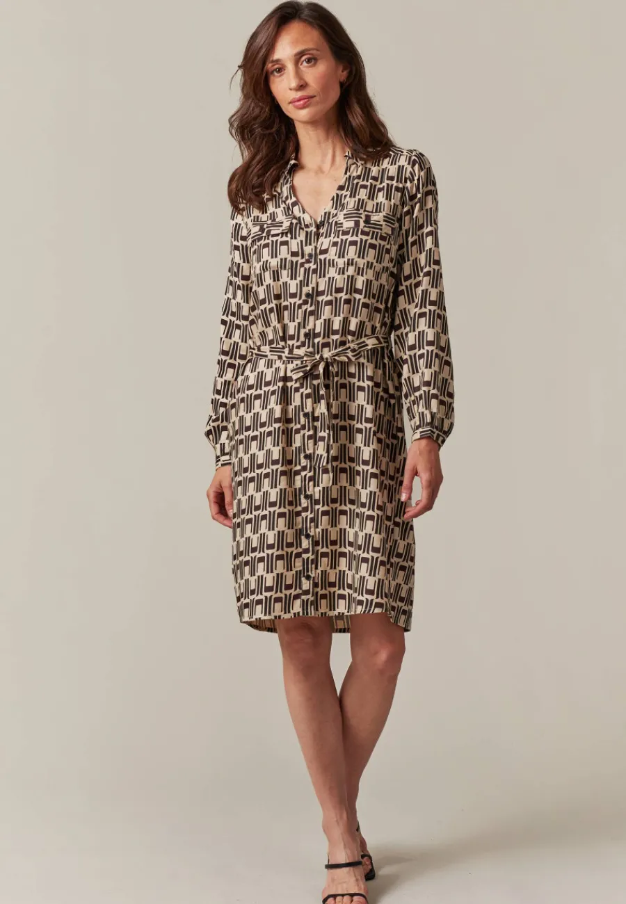 Cette robe classique arbore un motif géométrique dynamique, ajoutant une touche de modernité à son allure intemporelle.
