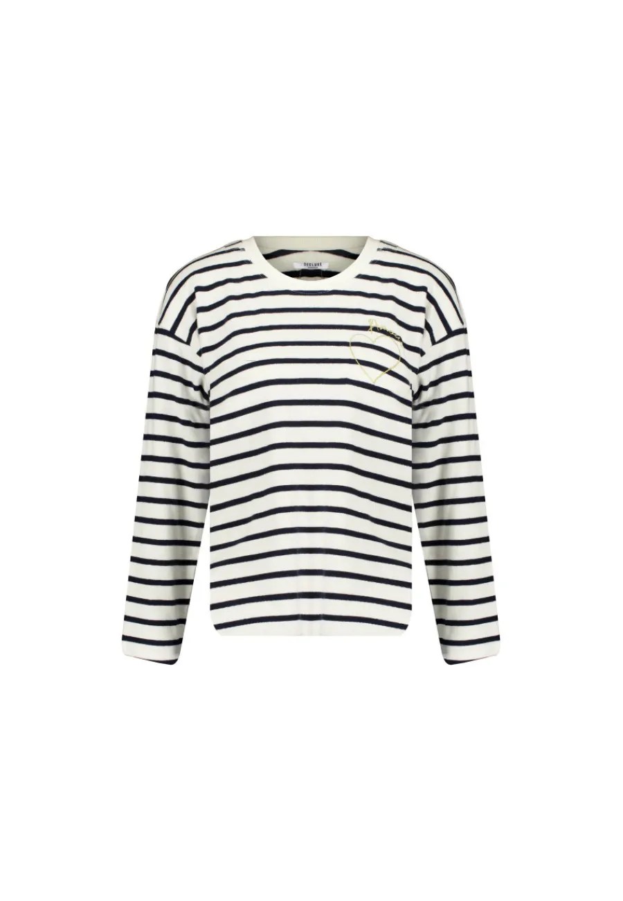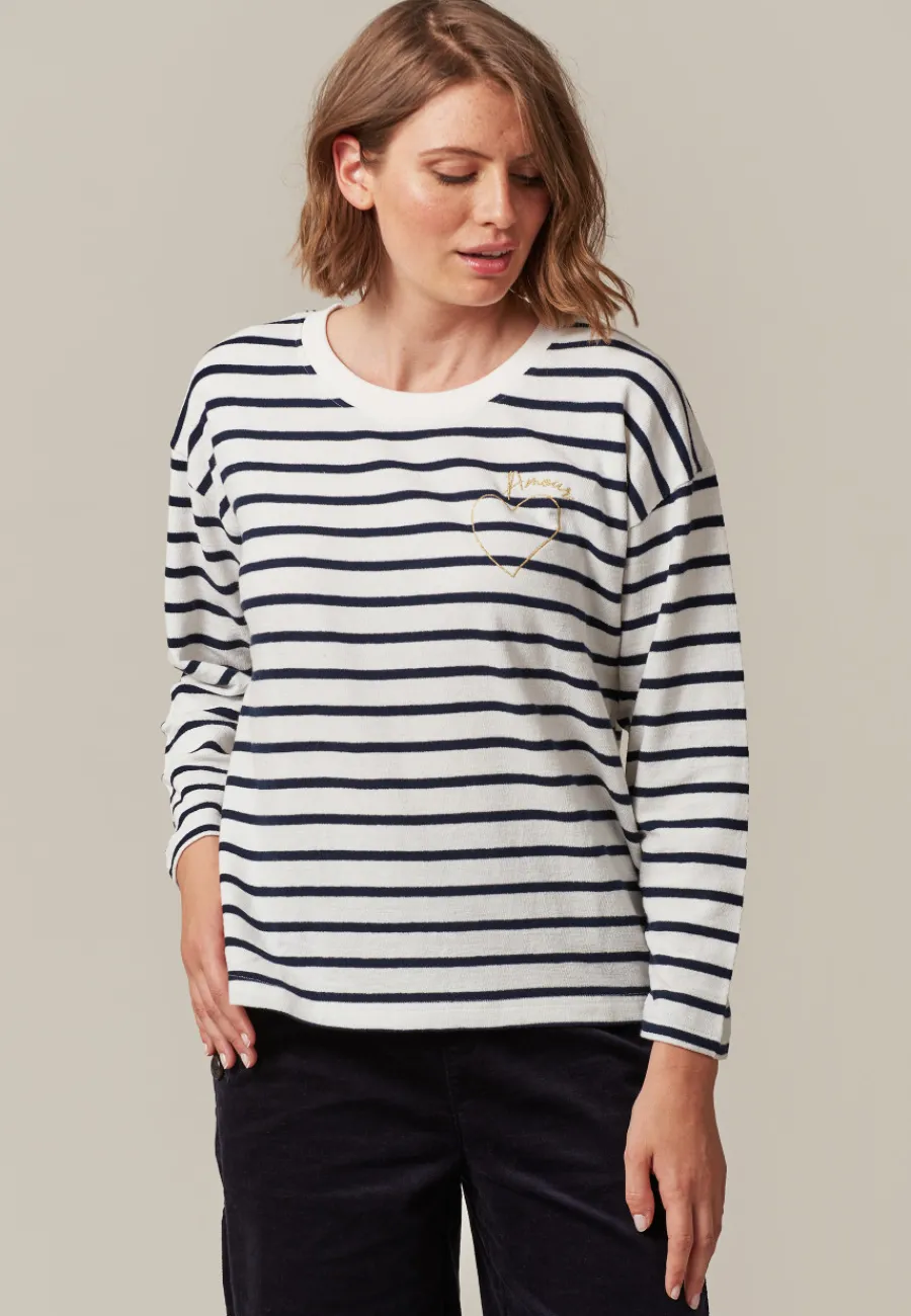 Ce t-shirt à rayures puise son originalité dans un cœur brodé avec le mot « amour » sur la poitrine. Ce détail apporte une touche de fantaisie et de douceur à cette pièce classique, ajoutant une note romantique et unique à la tenue.