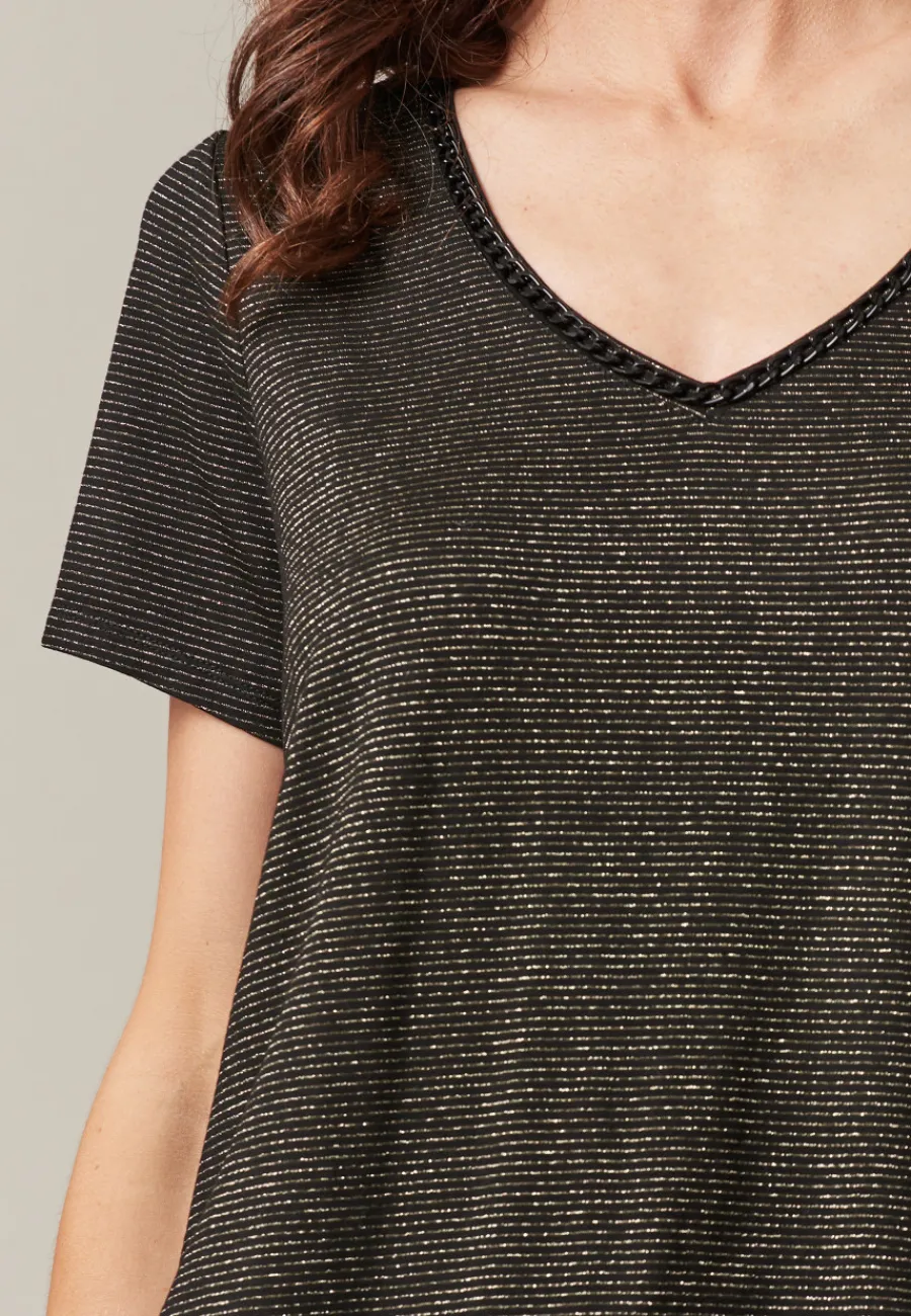 Confectionné en jersey lurex, un tissu avec un fini brillant, ce t-shirt pour femme se distingue par ses fines rayures horizontales réalisées avec un fil lurex scintillant, apportant une luminosité unique à votre tenue.