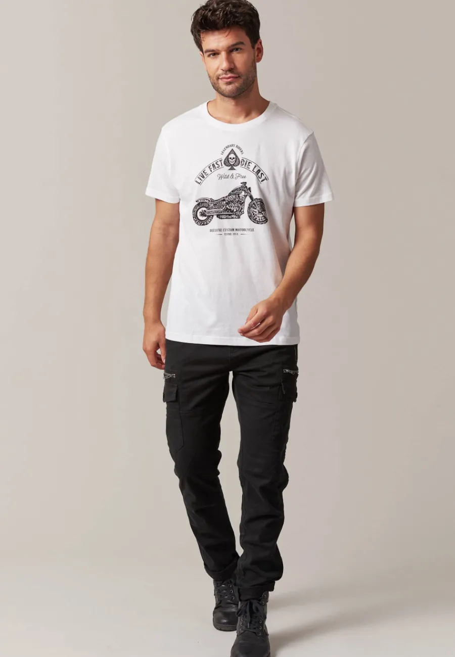 Sur le devant, le motif illustre une moto, accompagnée des inscriptions « Wild & Free » qui célèbrent la liberté et l’indépendance. Ce design est complété par la tête de mort emblématique de DEELUXE, intégrée dans un motif AS