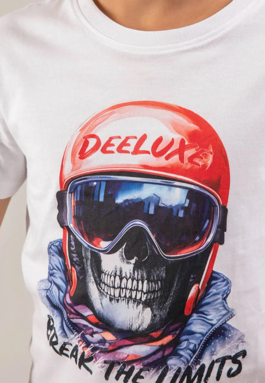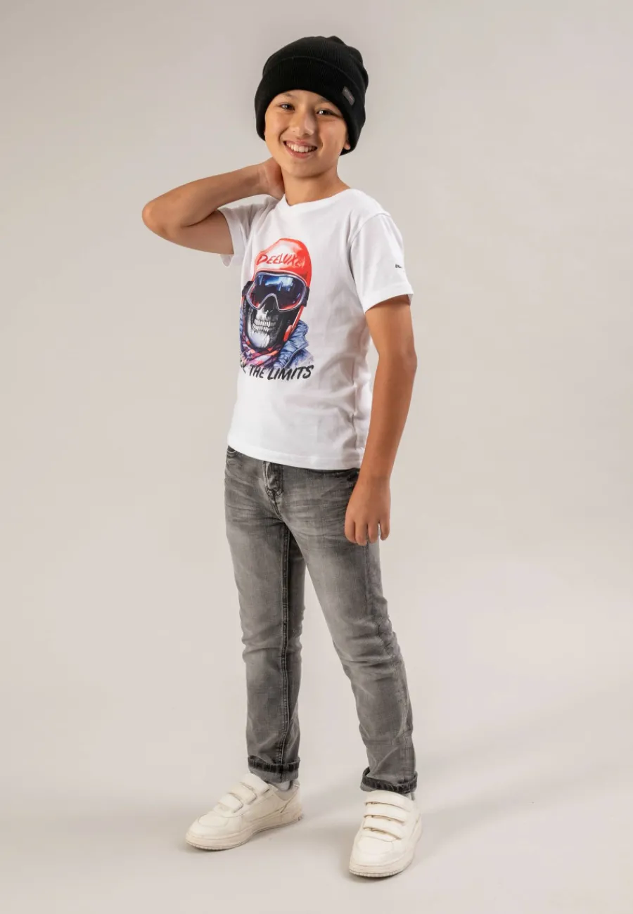 Le motif sur le devant représente une tête de mort portant un casque de ski, mélangeant l’esprit rock avec l’excitation des sports d’hiver. Le message « break the limits » invite à dépasser les frontières du style et à affirmer un look unique.